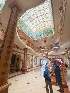 Bangunan utama resort menampilkan arsitektur elegan dengan sentuhan klasik. Interior megah dengan pilar-pilar berukir, tangga melingkar berornamen emas, serta langit-langit tinggi berpadu dengan cahaya alami dari atap kaca yang indah. Suasana ini menambah kesan eksklusif dan nyaman bagi setiap tamu yang datang.