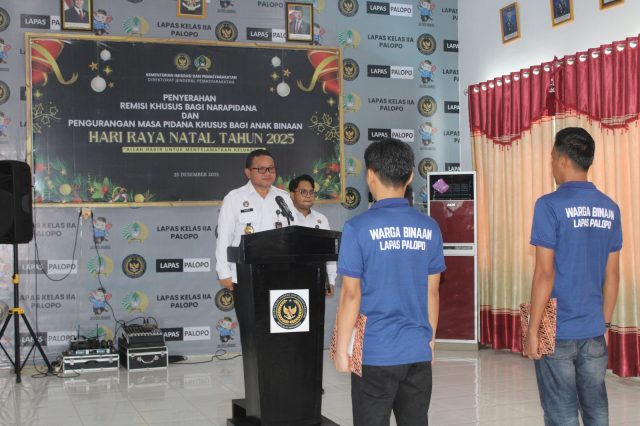 Palopo, Buletin-news.com — Dalam rangka memperingati Hari Raya Natal Tahun 2025, Lembaga Pemasyarakatan Kelas IIA Palopo melaksanakan kegiatan Penyerahan Remisi Khusus bagi Narapidana serta Pengurangan Masa Pidana Khusus bagi Anak Binaan, Kamis (25/12/2025), bertempat di Aula Lapas Kelas IIA Palopo.