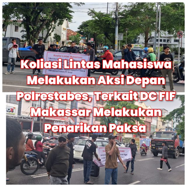 Makassar, Buletin-news.com || Koalisi Lintas Mahasiswa menggelar aksi unjuk rasa di dua titik, yakni Polrestabes Makassar dan Kantor Otoritas Jasa Keuangan (OJK), untuk mendesak aparat penegak hukum menindak tegas praktik perampasan kendaraan bermotor yang diduga dilakukan oleh oknum debt collector. Aksi tersebut dipimpin oleh Irwan.