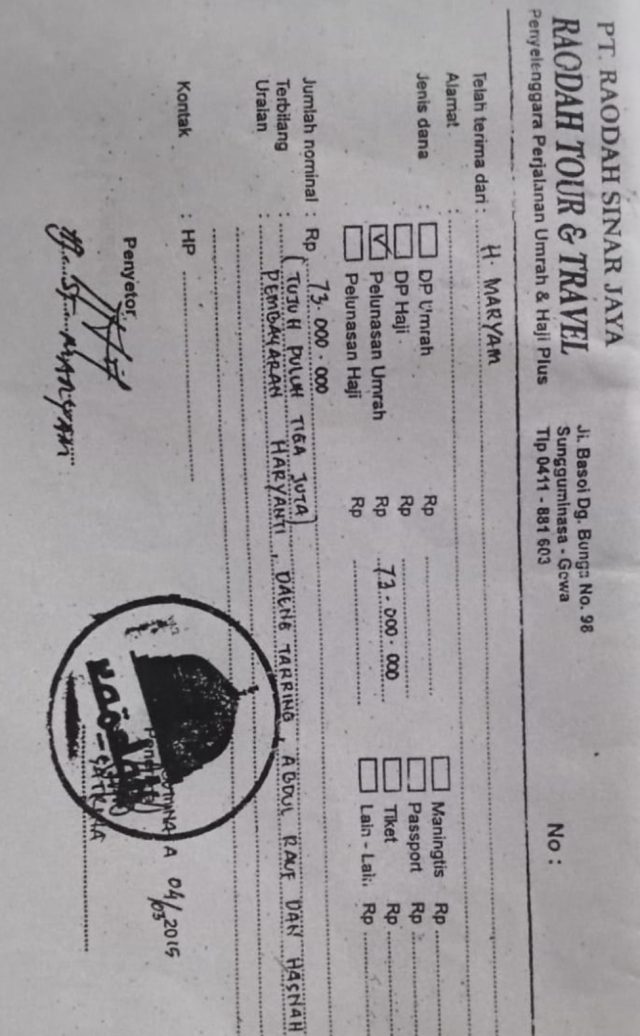 Gowa, Buletin-news.com || Lebih dari satu dekade menunggu, empat nyawa terbuang tanpa melihat keadilan, dan Rp240 juta uang rakyat lenyap tak berbekas. Kasus penipuan umroh yang dilakukan oleh PT Raodah Sinar Jaya (Raodah Tour dan Travel) bukan lagi sekadar kasus bisnis curang – namun dugaan perlindungan yang datang dari dalam anggota kepolisian sendiri membuat kasus ini menjadi batu sandungan yang menusuk hati masyarakat.