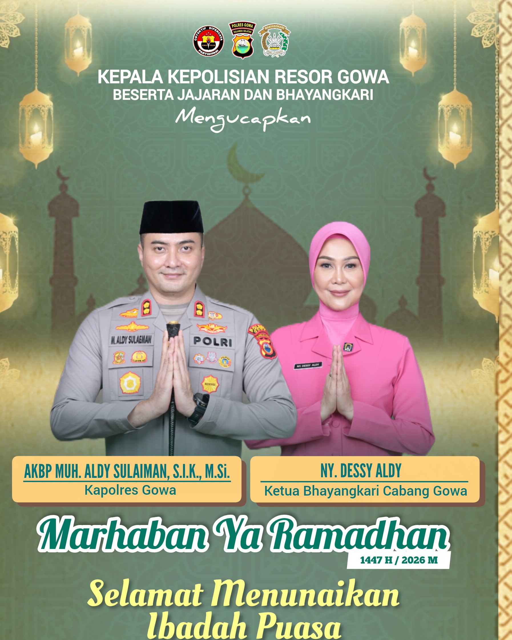 “Atas nama pribadi, keluarga besar Polres Gowa dan Bhayangkari, kami mengucapkan “Marhaban Ya Ramadhan” 1447 H/2026 M. Selamat menunaikan ibadah puasa. Semoga Allah SWT senantiasa melimpahkan rahmat, ampunan dan keberkahan-Nya kepada kita semua,” ujar AKBP Muh. Aldy Sulaiman.