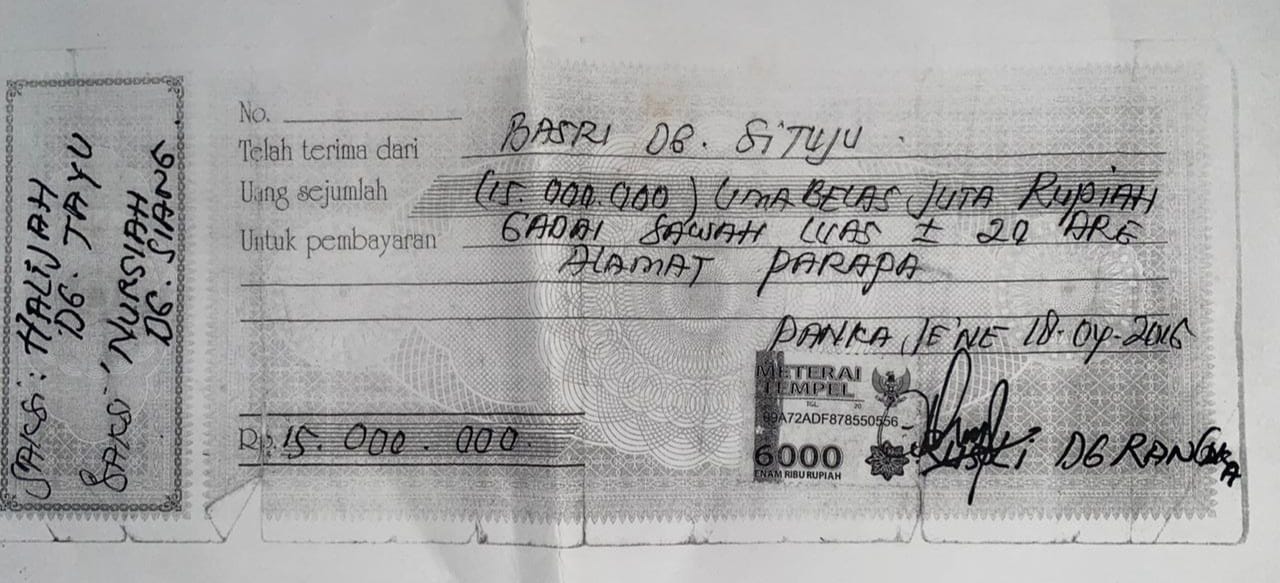 Perjanjian gadai tanah tersebut dilakukan kurang lebih 10 tahun lalu antara Basri dengan Dg Rangka, warga Pakkabba. Pada saat itu, kedua belah pihak telah menyepakati secara jelas: sawah diserahkan untuk dikelola Basri dengan imbalan hasil panen setiap musim, ditambah pengembalian modal sebesar Rp15 juta rupiah pada tenggat waktu yang telah disepakati bersama.