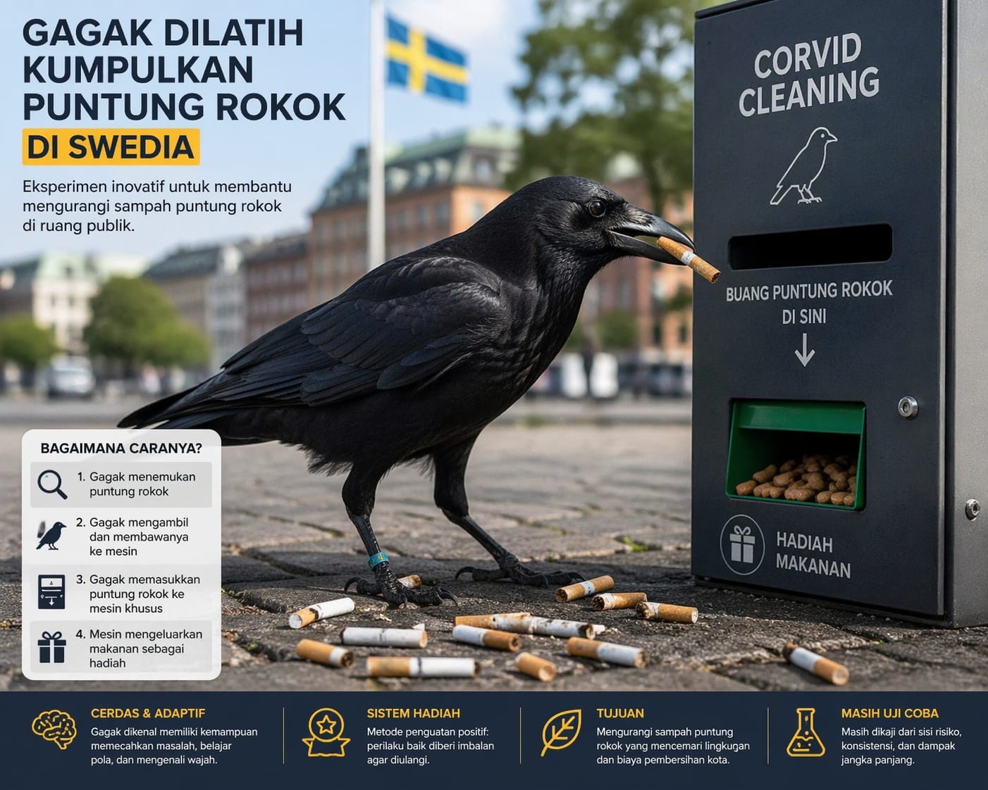 Konsepnya sederhana: gagak diarahkan untuk memungut puntung rokok yang berserakan, lalu memasukkannya ke dalam mesin khusus.
