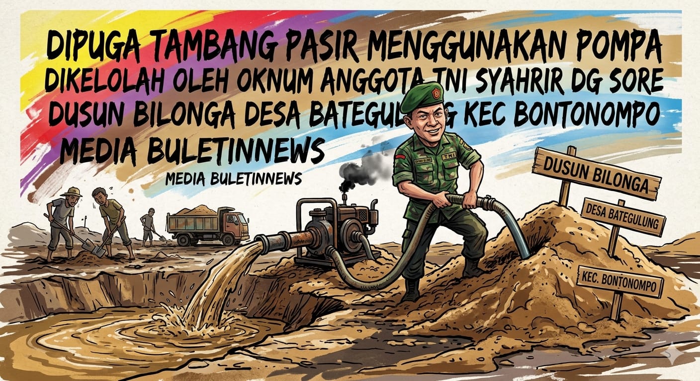 Gowa, Buletin-news.com – Keterlibatan oknum aparat dalam bisnis pertambangan liar kembali terungkap. Kali ini perhatian publik mengarah pada seseorang bernama Sharir Dg Sore, yang diduga kuat merupakan anggota TNI, namun diduga terlibat aktif sebagai pengelola tambang pasir ilegal. Lokasi penambangan yang diduga tidak memiliki izin resmi ini berada di Dusun Bilonga, Desa Bategulung, Kecamatan Bontonompo, Kabupaten Gowa.